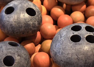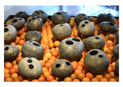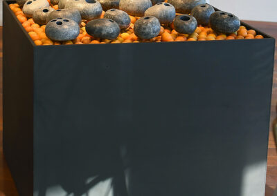 Untitled depicts a grouping of dark forms with multiple holes, a species of sorts that are struggling to survive despite the increasing amounts of daily “noise” surrounding them. Often, the genesis of my sculpture starts with a strong visceral feeling. With this piece, I create clay forms with an increasing number of holes. These forms are made with rubber molds, then cast in Ultracal 30, a gypsum cement. To create the toxic environment, I painted ping pong balls in seductive shades of muted orange. My work strives to grapple with both the strength and vulnerability of the human condition.